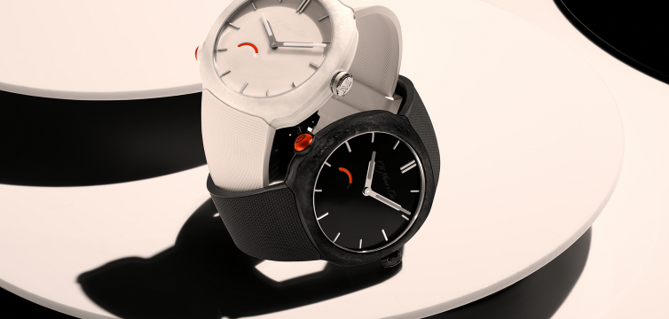 Часы сразу же приковывают к себе внимание. На черном или белом циферблате расположился оранжевый индикатор запаса хода на 8 часах. Рядом находится кнопка, аналогичная той, что на кроссовках Reebok. Каждое нажатие на эту кнопку добавляет около часа запаса хода, а при достижении максимума в 74 часа можно продолжать нажимать для удовольствия.