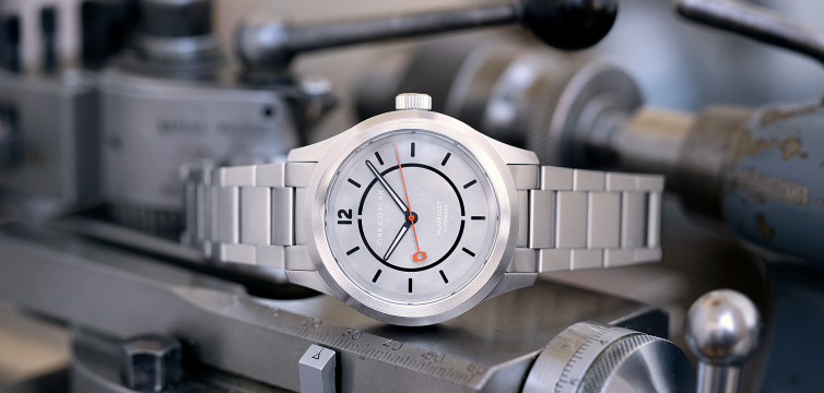 Результатом стала инструментальная модель из нержавеющей стали размером 39,5 мм на 12,4 мм с механизмом Sellita SW300, обеспечивающим часы, минуты и центральные секунды, и водонепроницаемостью до 200 метров. Важной частью истории бренда стали этапы создания этой модели. Циферблат вырезан и обработан на токарном станке Schaublin 70, затем прикреплен к лазерно-вырезанному алюминиевому циферблату, после чего пробиты отверстия для индексов. Все детали соединены и закреплены, а затем обработаны матовым покрытием с применением 50-микронного карбида кремния. В завершение, циферблат маркирован лазером для создания призрачного эффекта и соединен с третьим слоем алюминия. Все это производится в штаб-квартире компании в Чикаго. Завершающий штрих — фиксированный безель из нержавеющей стали, изготовленный на том же станке.